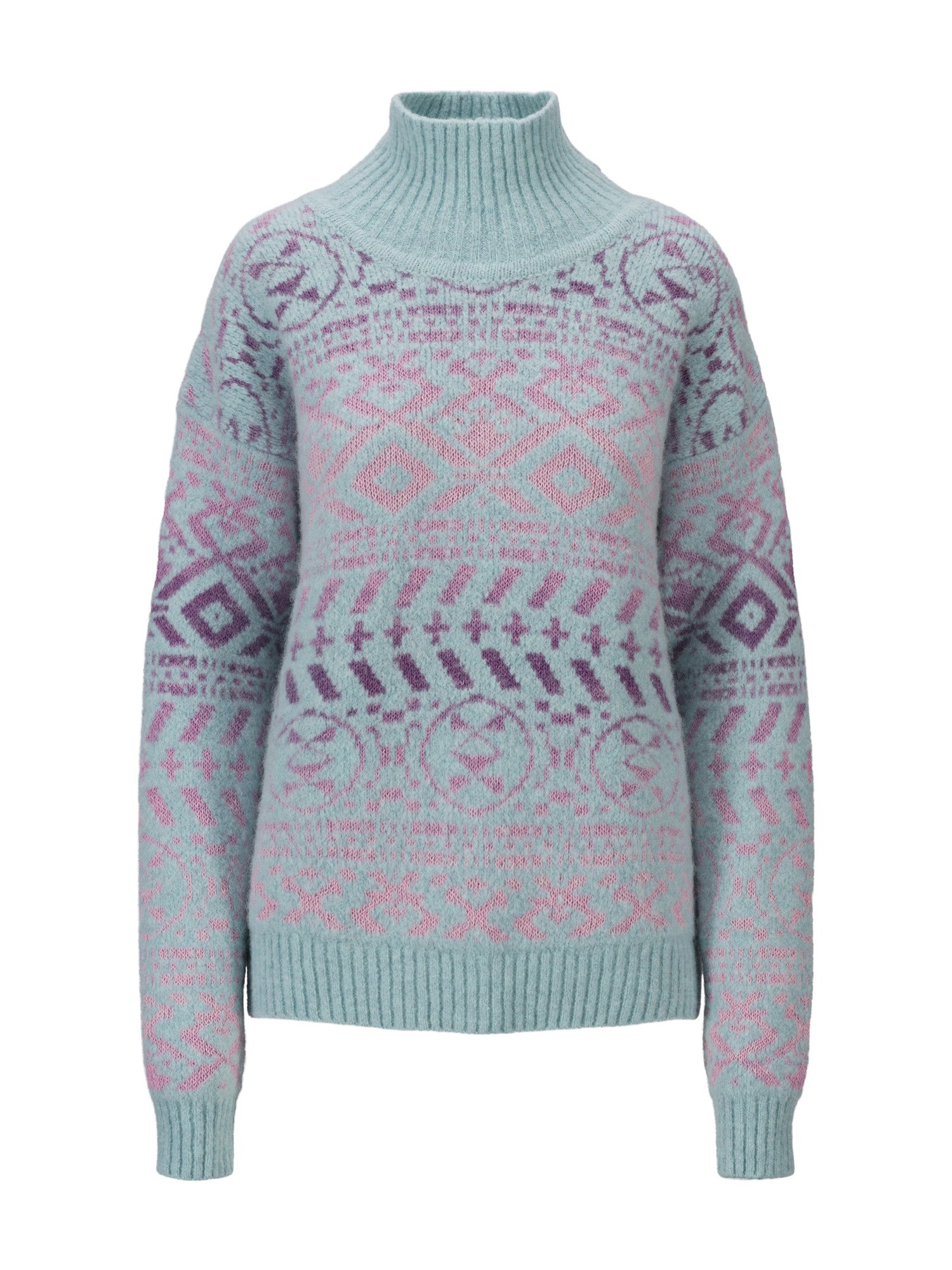 With a relaxed fit and a high neck, the Highland sweater delivers a bold, soft, and strikingly patterned style. There is playfulness in both the color choices and the textures. The airy and luxurious alpaca yarn forms a solid base. The pattern is knitted in a cotton yarn with an ombré effect, where each cotton thread has graduated colors. This yarn also has a flatter structure. Together, this creates both contrast and depth, making it a sweater that truly stands out.