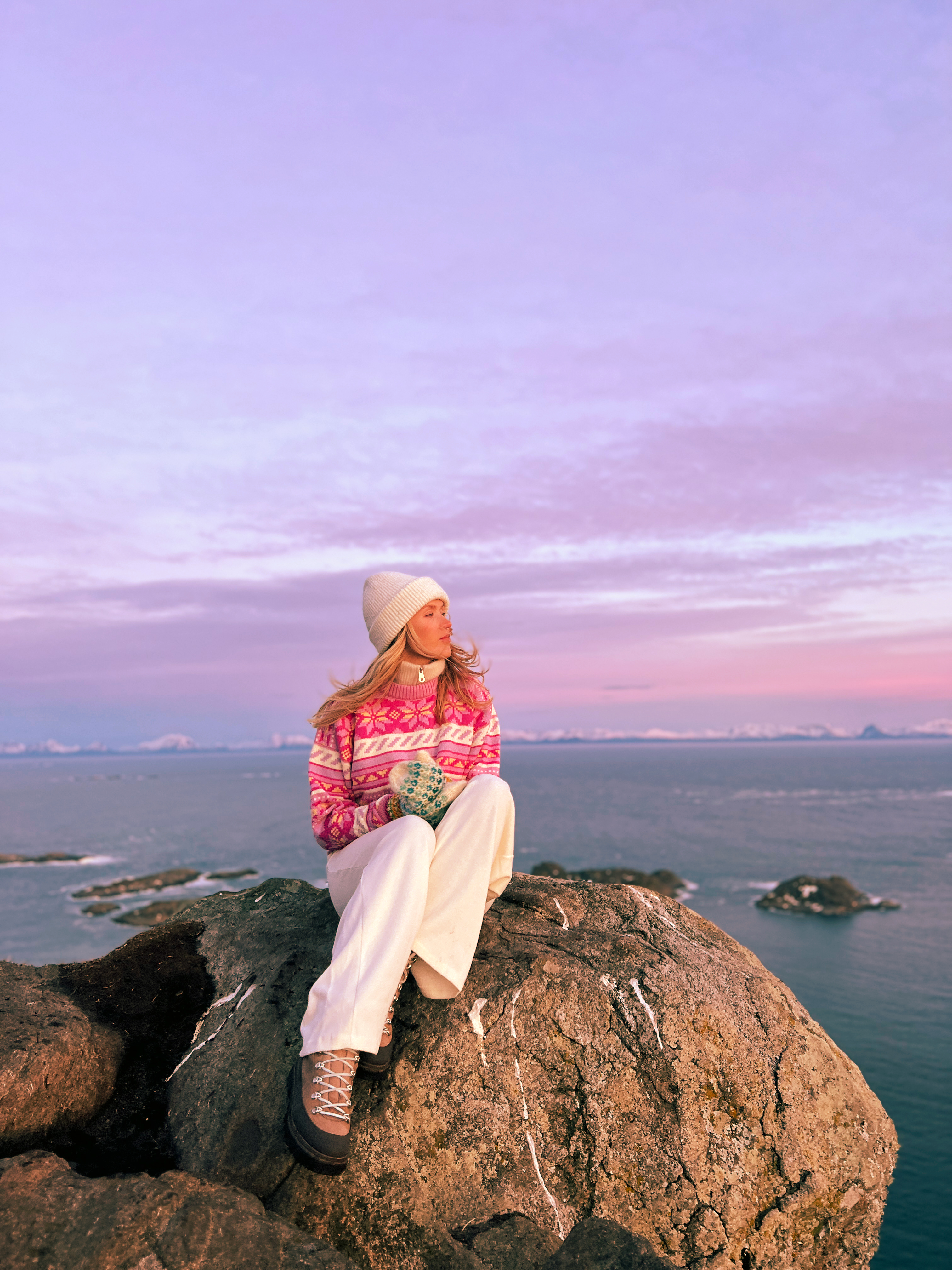 Dale of Norway and Ingrid Raadim Hennig are now launching this season’s colorful Ingrid Sweater! This is the third sweater in the ongoing collaboration, and once again, Ingrid has designed a piece that captures the essence of the North. Inspired by the magical sunsets hues in Lofoten, the color palette reflects a beautiful blend of pink, purple, and hints of yellow—a tribute to the spectacular light Ingrid loves.